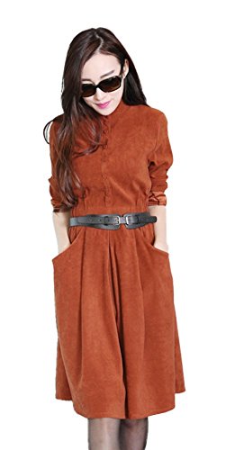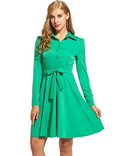 ผู้หญิง Turn Down Collar Long Sleeve Pleated Swing Shirts Dress เดรส แฟชั่นชุดทำงาน With Belt ANGVNS