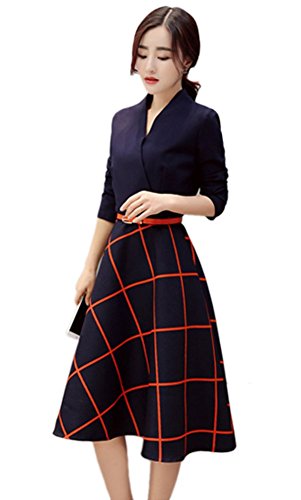 ชุดแซกสวยๆ ใส่ทำงาน iRachel ผู้หญิงs Long Sleeve V Neck Casual Slim Tunic Plaids A-Line Shirt Dress เดรส แฟชั่นชุดทำงาน