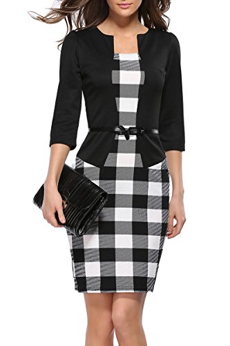 ชุดแซกสวยๆ ใส่ทำงาน Meaneor ผู้หญิง 1/2 Sleeves Fit and Flare Plaid Casual Summer Dress เดรส แฟชั่นชุดทำงาน