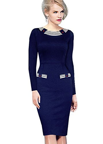 ผู้หญิง Retro Navy Style 1/2 Sleeve Slim Bodycon Business Pencil Dress เดรส แฟชั่นชุดทำงาน Lmeison