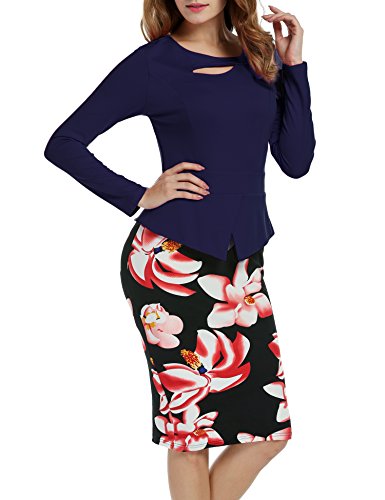 ผู้หญิง Keyhole Neck Floral Print Cotton Peplum Bodycon Office Dress เดรส แฟชั่นชุดทำงาน ANGVNS